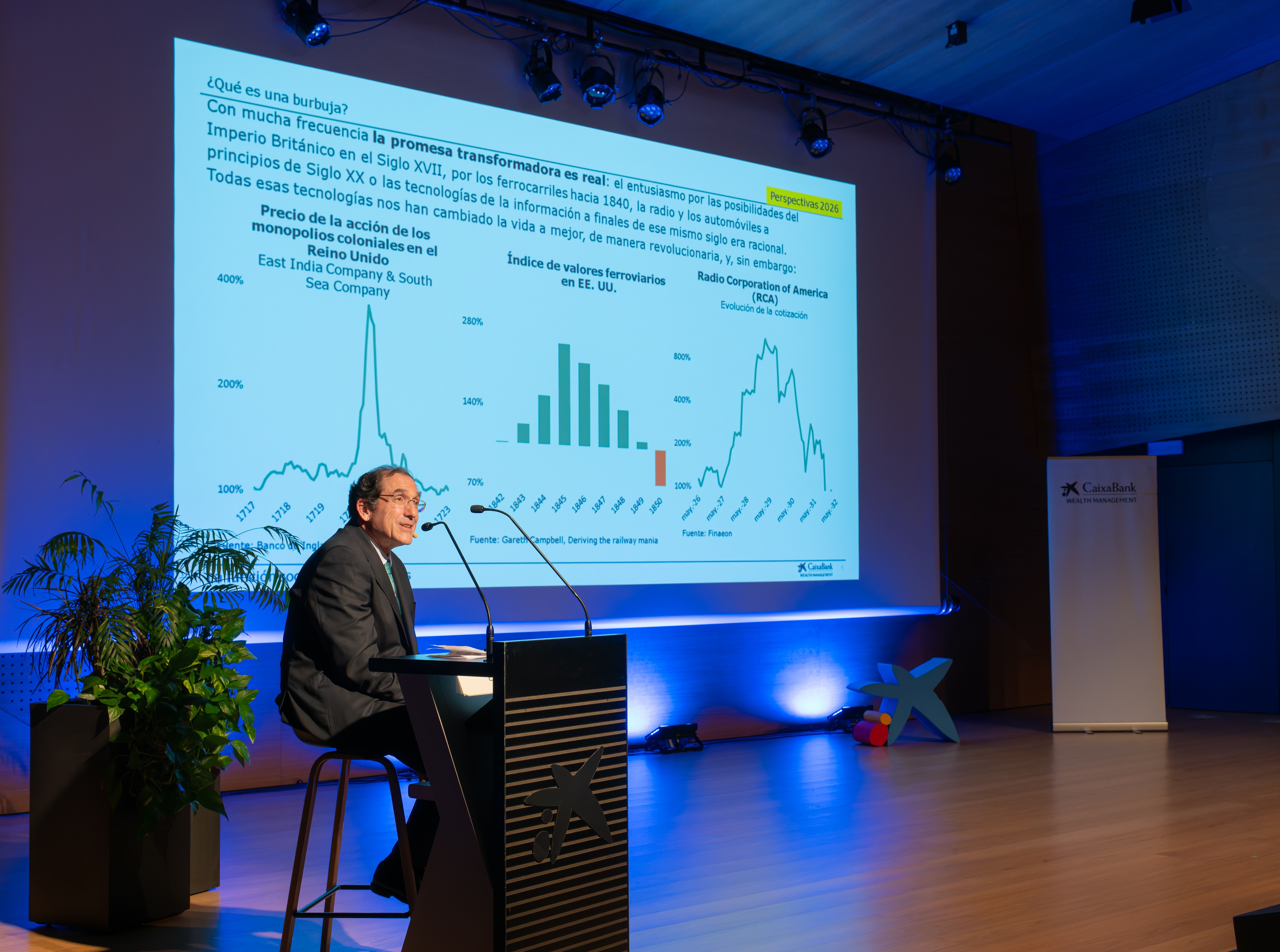 CaixaBank Wealth Management ha reunido en Zaragoza a más de 200 clientes de la entidad para analizar la evolución de los mercados y dar a conocer las previsiones económicas y financieras, y las tendencias de inversión para el ejercicio 2026. La jornada, con una presentación titulada “La función social de las burbujas”, se enmarca en el ciclo anual de conferencias ‘Perspectivas’; una iniciativa ya consolidada para clientes pertenecientes al segmento de Wealth Management de la entidad, con más de 20 encuentros repartidos por toda la geografía española.