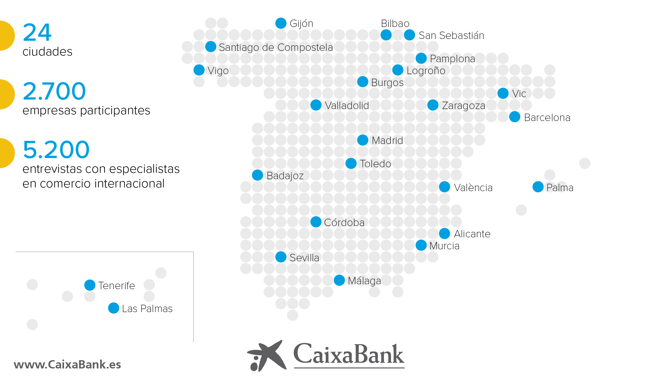 Desde 2008, más de 2.700 empresas han participado en las Jornadas Puertas al Exterior. Se han realizado más de 5.200 entrevistas con los especialistas de CaixaBank en comercio internacional. El banco ha llevado esta iniciativa a 24 ciudades de todas las comunidades autónomas.