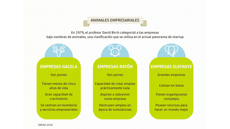 La categorización entre empresas elefante, gacela y ratón proviene de un estudio del profesor del MIT David Birch del año 1979. Desde entonces ha pasado tiempo, pero el panorama actual de startup todavía permite utilizar algunas de las claves de estas especies empresariales. Entremos en el zoo.
