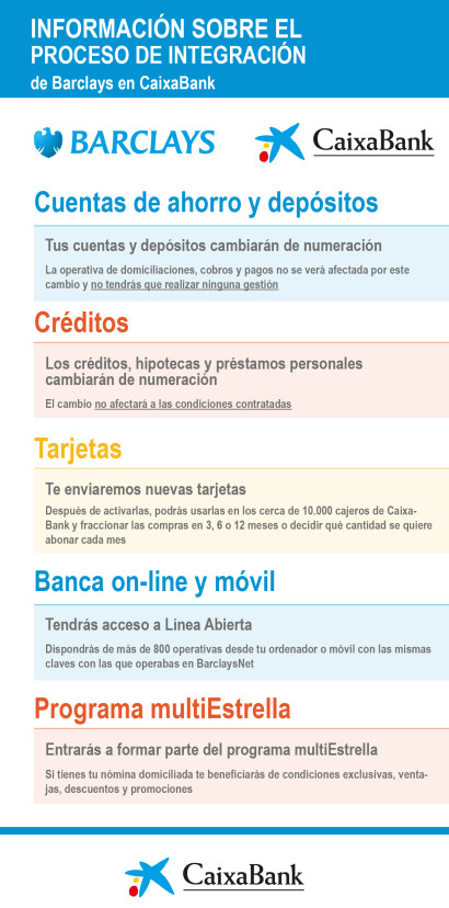 A partir de este fin de semana se hará efectiva la integración de Barclays Bank SAU en CaixaBank, un proceso que se inició el pasado 31 de agosto con el anuncio del acuerdo entre CaixaBank y Barclays Bank, P.L.C. para adquirir el negocio de banca minorista, gestión de patrimonios y banca corporativa de Barclays en España