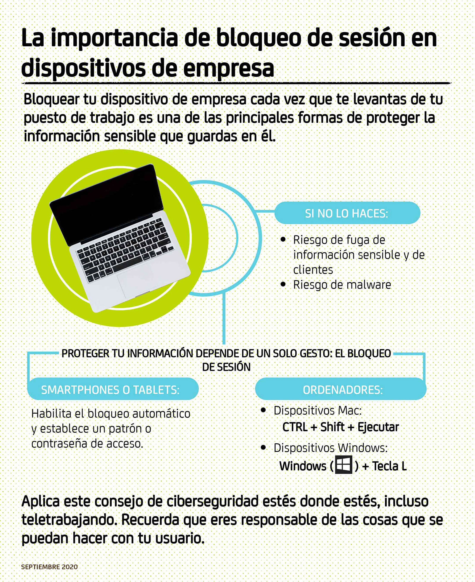 El objetivo principal de bloquear la sesión en tus dispositivos de empresa es impedir que otras personas puedan usar tu escritorio y acceder a tus datos (archivos, imágenes, documentos confidenciales, etc).