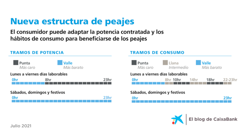 Los tres periodos de los peajes de acceso son horas punta (el más caro), horas llanas (precio intermedio) y horas valle (el más económico). El hecho de que sea más o menos barata la energía en estos tres tramos tiene que ver con estos peajes. El objetivo de este cambio es fomentar la eficiencia energética en los hogares.