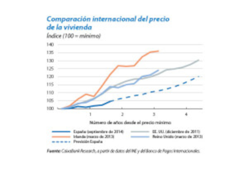 Esta recuperación seguirá al alza según las estimaciones de CaixaBank Research. En concreto se prevé que el crecimiento del precio de la vivienda ronde el 3% este año y que vaya en aumento hasta alcanzar el 5,5% en 2018. Aunque tal vez parezca una previsión optimista, resulta un crecimiento moderado si se compara con la evolución que se ha experimentado en países que también han sufrido una severa corrección recientemente, como es el caso de Irlanda, EE. UU. y Reino Unido.