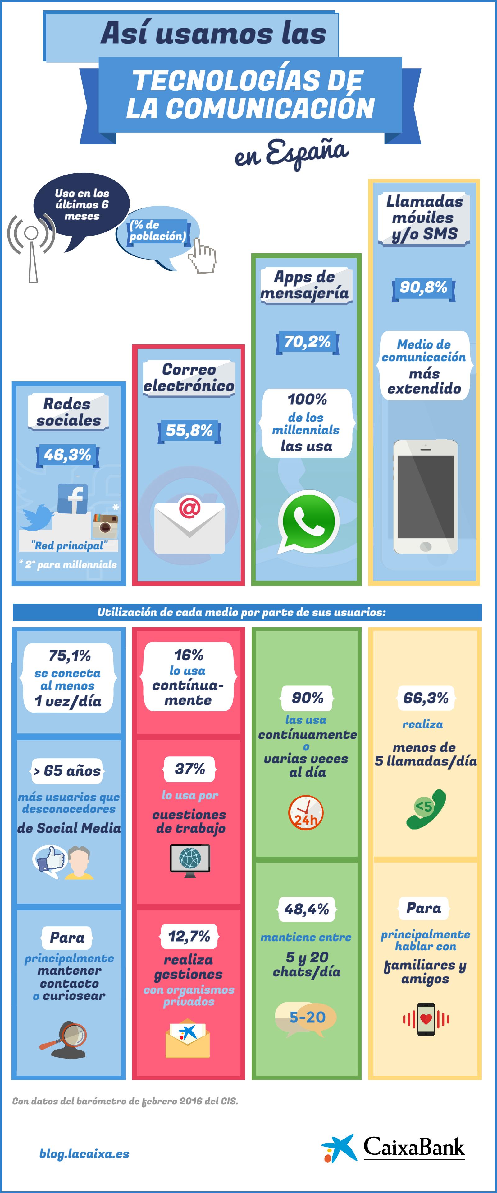 El último barómetro del Centro de Investigaciones Sociológicas (CIS), correspondiente al mes de febrero de 2016, ha confirmado lo que era un secreto a voces. Móvil, redes sociales y servicios de mensajería instantánea forman parte del ADN de los españoles, tanto para uso personal como para relacionarse con las empresas. Estos son los aspectos más llamativos del estudio: