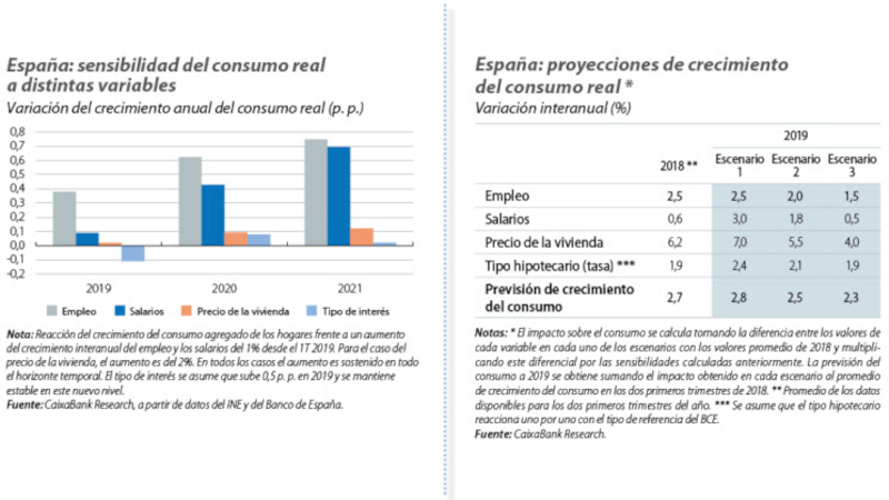 El informe analiza la sensibilidad del consumo a la evolución de los factores que determinan los ingresos de los hogares: empleo, salarios, tipos de interés y precio de la vivienda. Los resultados son los siguientes: por un lado, la reacción del consumo frente al aumento del empleo es mucho mayor que en respuesta a un incremento salarial, al menos a corto plazo. La explicación que ofrece el informe es que «nuestros patrones de consumo cambian más cuando pasamos de estar desempleados a obtener un trabajo que como reacción a variaciones en el sueldo». Por otro lado, la respuesta del consumo se incrementa a lo largo del tiempo y las diferencias entre el impacto del empleo y los salarios se reducen.