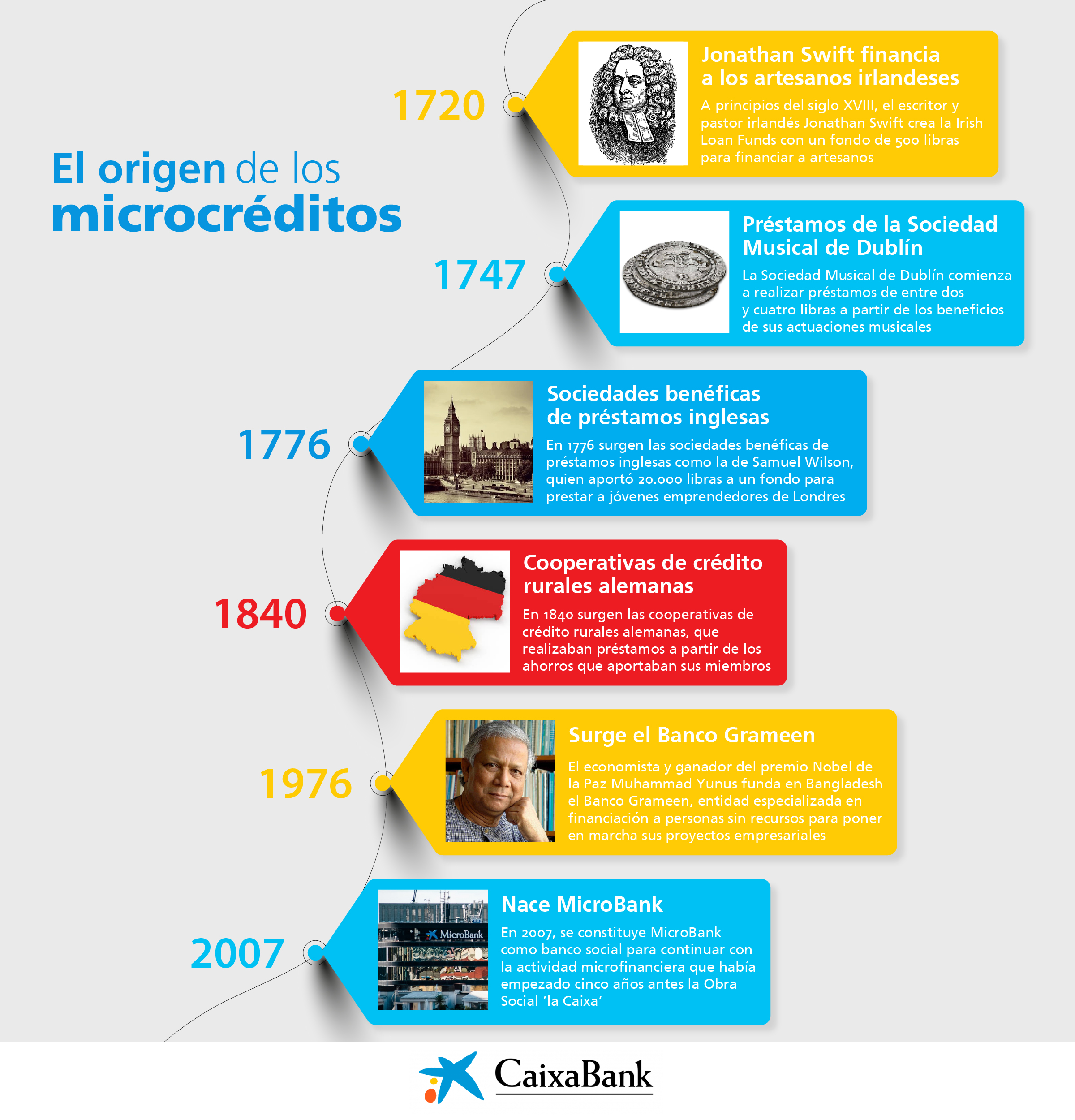 De hecho, así es como surgió MicroBank en 2007, como un banco social cuya misión consiste en preservar la función de acceso al crédito a los colectivos con mayores dificultades. De esta manera, daba continuidad a la labor que ”la Caixa” había iniciado desde su fundación en 1904. En realidad, los primeros microcréditos se concedieron en 2002 a través de la Obra Social “la Caixa”, aunque esta actividad la continuaría MicroBank desde su puesta en marcha.