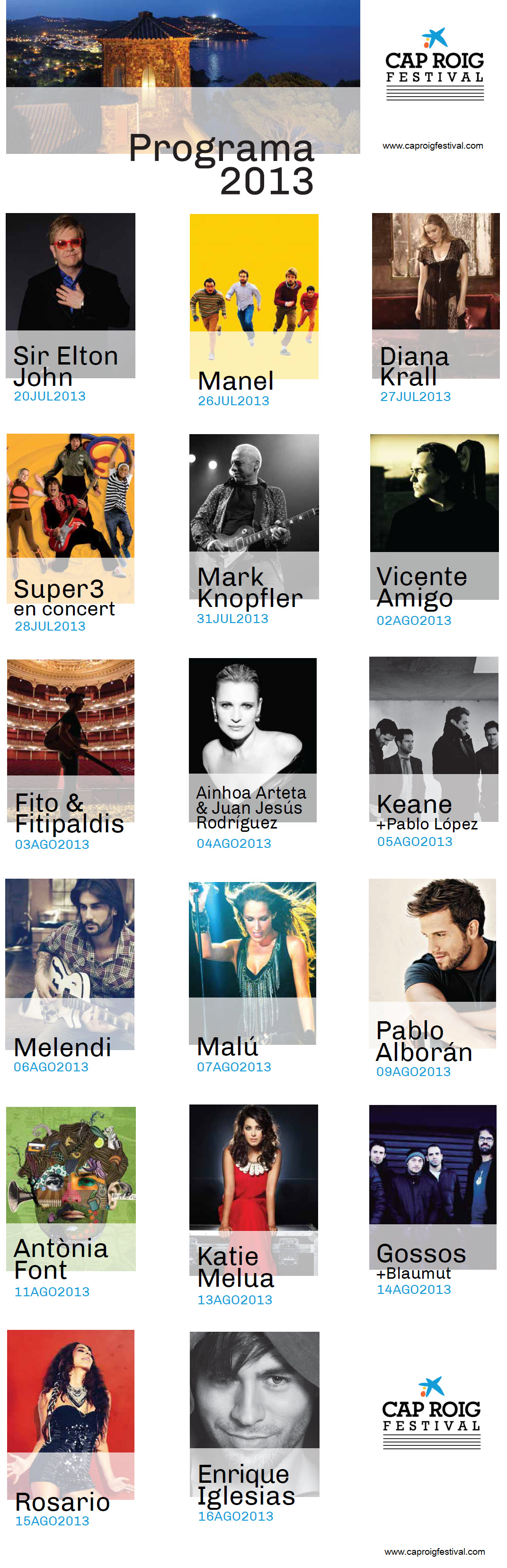 El cartel de la 13ª edición del Festival de Cap Roig vuelve a recoger todos los géneros musicales, con artistas que son una referencia nacional e internacional: Mark Knopfler, Keane, Diana Krall, Katie Melua, Manel, Gossos, Blaumut, Antònia Font, Vicente Amigo, Fito & Fitipaldis, Melendi, Malú, Pablo Alborán y Rosario.