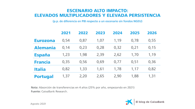 También apuntan que, al ser una ayuda coordinada y procedente de la Unión Europea, cabe esperar un impacto positivo adicional derivado de los efectos que tendrá en los distintos países. Además, la coyuntura es oportuna, especialmente después de haber superado el primer shock de la COVID-19 combinado con un entorno de tipos de interés muy bajos.