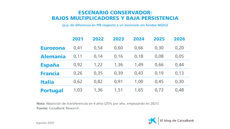 En el escenario más conservador, los multiplicadores del plan son bajos, pero aun así podría llevar a un incremento anual del PIB español de entre el 0,9 % y el 1,4 %.