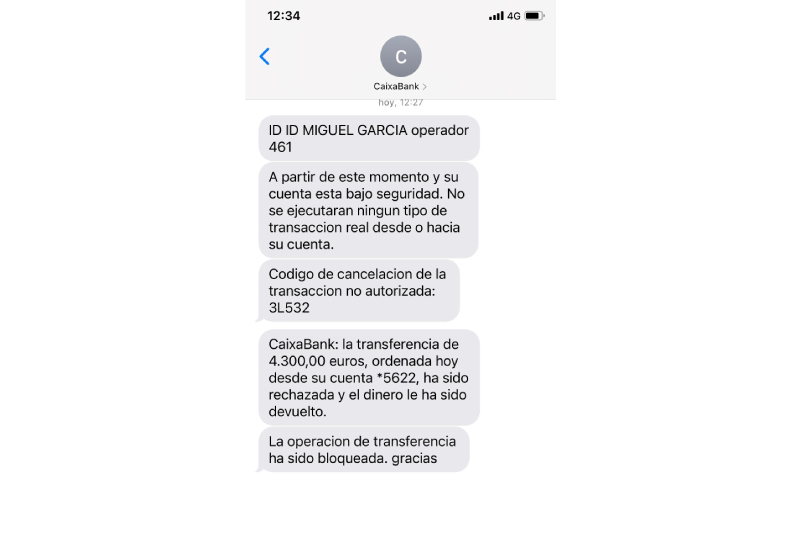 4. El ciberdelincuente se presenta como empleado de CaixaBank e informa a la víctima de que existen movimientos sospechosos en su cuenta. Para resolverlos, le solicita las claves personales y le pide firmar la retrocesión de las operaciones a través de CaixaBank Sign. Es posible que, para dar más credibilidad a la llamada, el ciberdelincuente emita falsos mensajes de texto informando sobre las gestiones que está llevando a cabo.