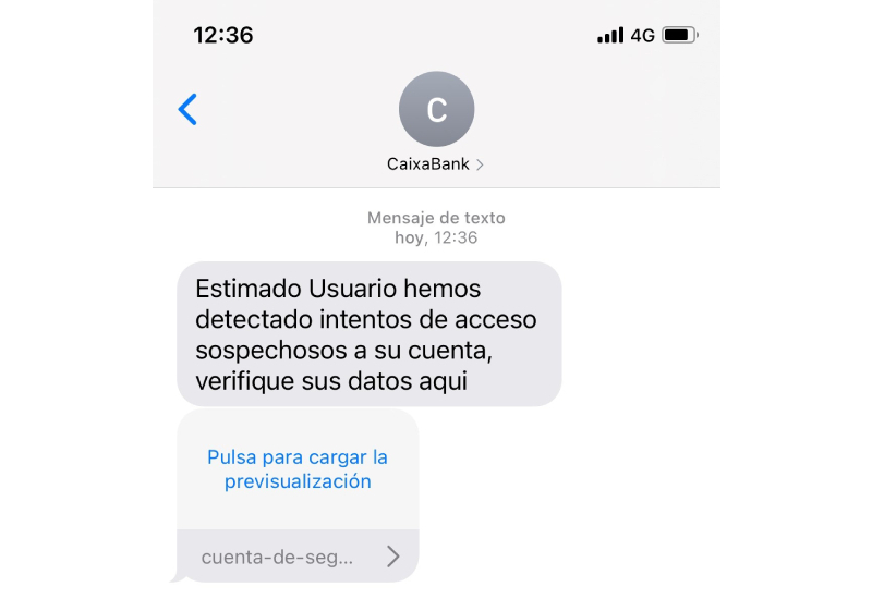 1. La víctima recibe un mensaje de texto (SMS), supuestamente de CaixaBank, en el que se alerta de que “hemos detectado intentos de acceso sospechosos a su cuenta”, “debe activar su sistema de seguridad web” o bien “su cuenta quedará bloqueada”. Siempre incorpora un enlace al que insta a clicar. Este mensaje de texto puede aparecer junto con otros mensajes que ha emitido CaixaBank con anterioridad.