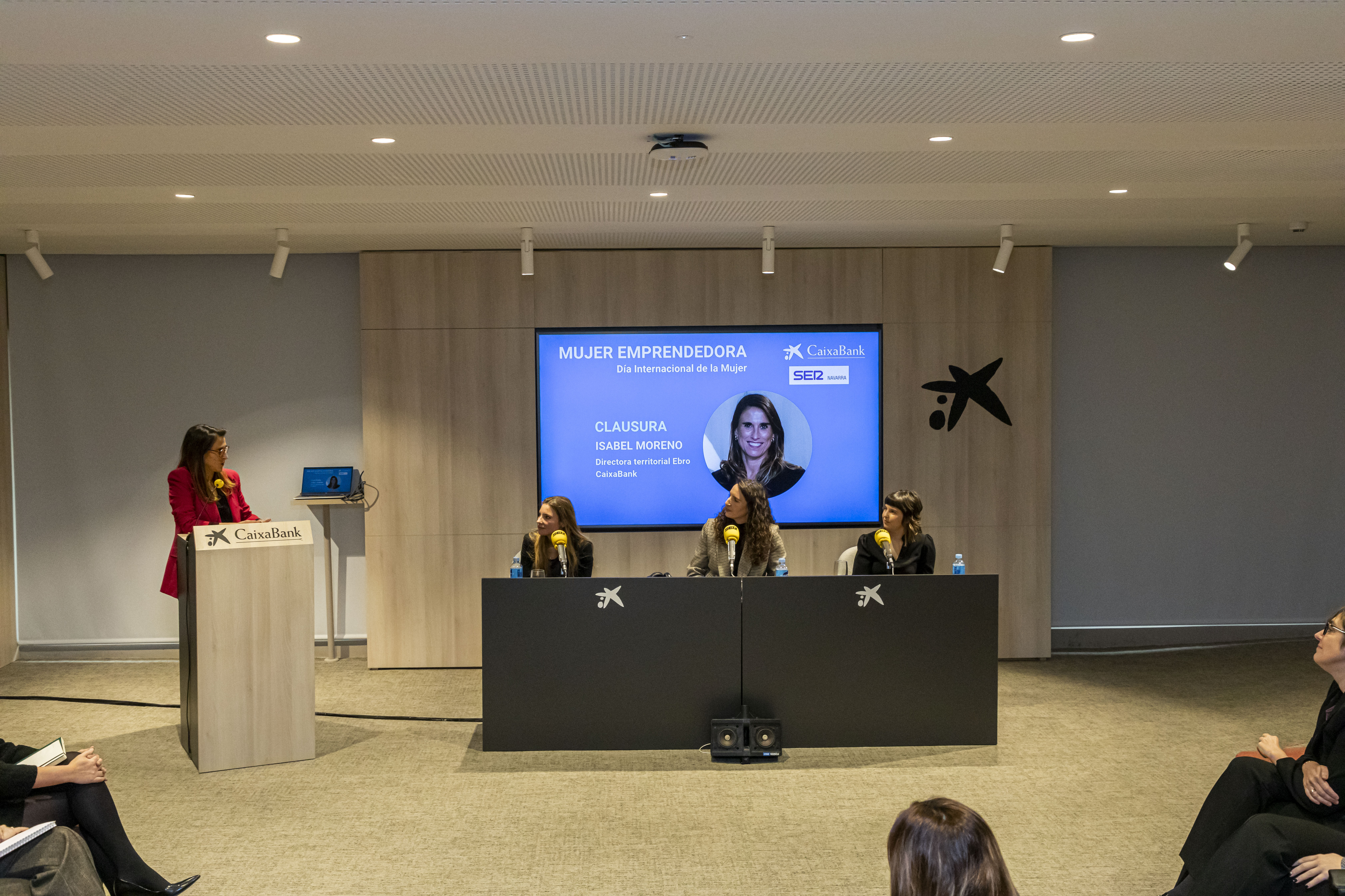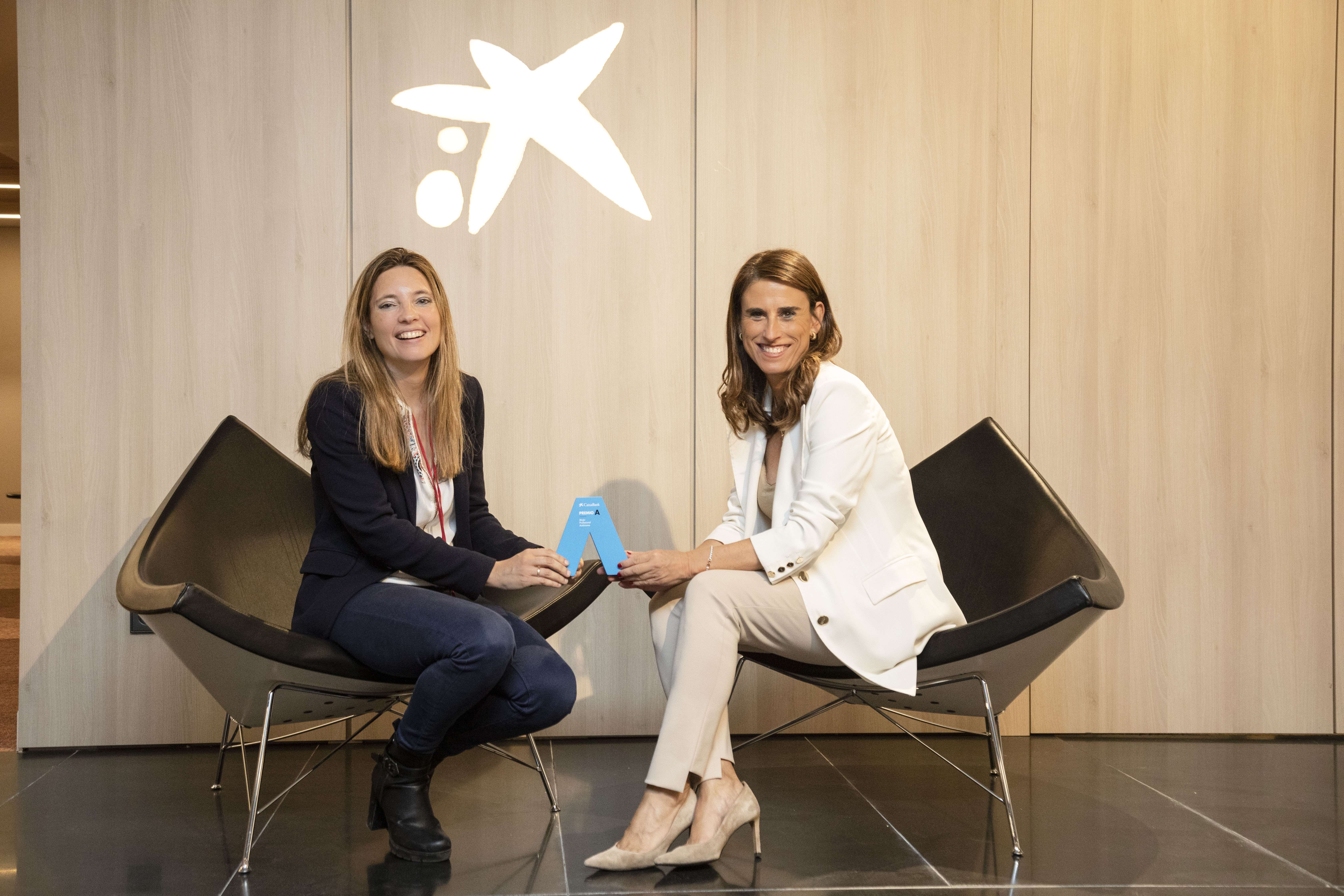 De izquierda a derecha: Elena Moreno junto a Isabel Moreno, directora territorial Ebro de CaixaBank en la entrega del Premio A.