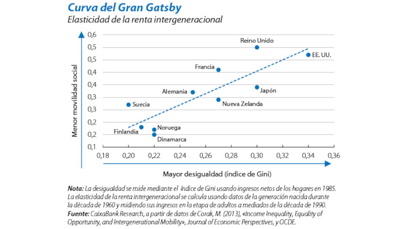 No obstante, pronto se descubre que la historia de Jay Gatsby (protagonista de la novela) no es una historia de éxito. Prueba de ello es la curva del Gran Gatsby, un gráfico que relaciona de forma directa la desigualdad económica y la movilidad social, entendida como la relación entre la situación económica o social de padres e hijos. Según sugiere esta curva, y tal y como expone el dossier del informe mensual de marzo de CaixaBank Research “Igualdad de oportunidades y movilidad social”, los países más desiguales tienen una menor movilidad social.