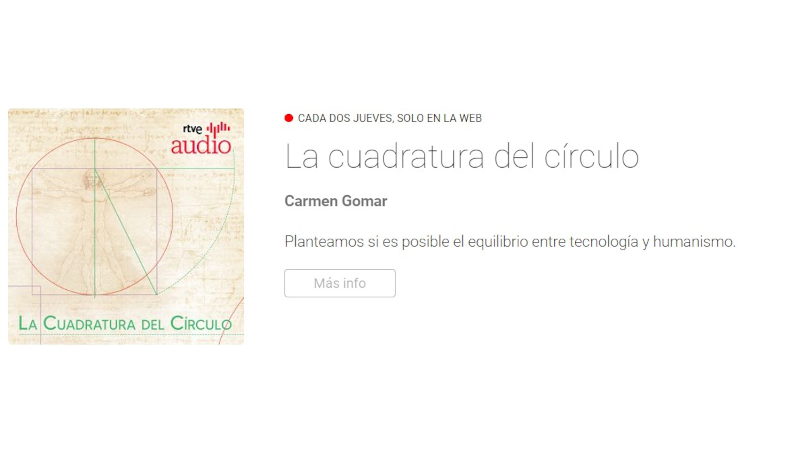 Carmen Gomar guía estas reflexiones, de media hora, en las que algún invitado aporta su punto de vista. La ética en la IA, la conciencia de las máquinas, cómo evitar las distracciones del entorno digital, el crédito social o el reconocimiento facial son algunos de los asuntos que abordan los capítulos de La cuadratura del círculo.