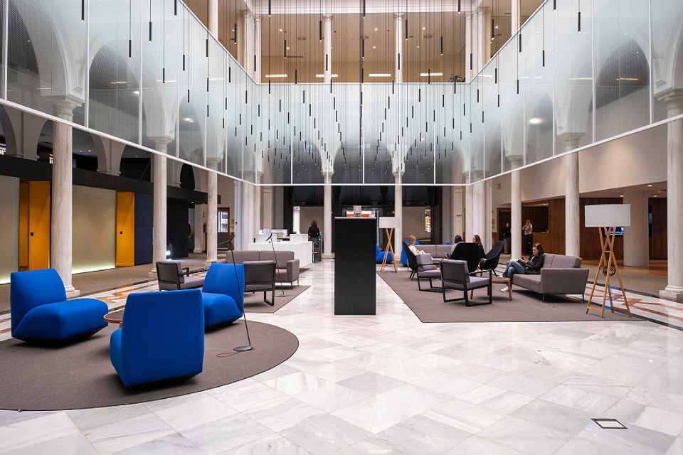 A más de 700 kilómetros, en la concurrida calle Sierpes de Sevilla, se encuentra la sede de la Dirección Territorial de CaixaBank en Andalucía. Su ubicación: la finca donde estaba la antigua Cárcel Real de la capital hispalense, un edificio medieval del siglo XIII, que en el siglo XVI fue reformado y entre cuyos presos destacaron ilustres personalidades del Siglo de Oro Español como Mateo Alemán, Alonso Cano y Cervantes. En el prólogo de Don Quijote, allá por 1605, el propio autor da a entender que concibió a su personaje más universal en la cárcel, entre esas paredes. Derribada en el siglo XIX, fue después hotel, café, sede del Círculo de Labradores y, en la actualidad, su luminoso patio acoge eventos, exposiciones y recibe a diario a decenas de clientes de CaixaBank que, siglos después, escriben sus propias historias.