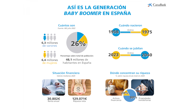 La riqueza de los baby boomers —esto es, su patrimonio total— está principalmente concentrada en el ladrillo a través de la vivienda en propiedad. Según el estudio de CaixaBank Research, aproximadamente el 77 % de los hogares con un cabeza de familia de 46 a 64 años poseía en 2020 una vivienda principal en propiedad, y aproximadamente la mitad de estas personas poseen otras propiedades inmobiliarias.