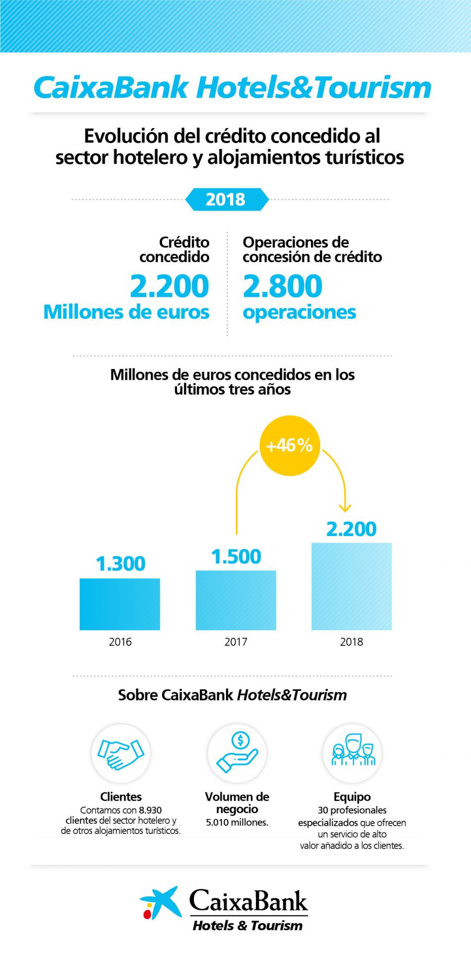 Solo en 2018, CaixaBank Hotels&Tourism concedió un total de 2.200 millones de euros en crédito al sector hotelero y de otros alojamientos turísticos, a través de un total de 2.800 operaciones. En este sentido, aumentó el crédito concedido un 46% respecto a 2017, cuando sumó 1.500 millones de euros. Con estos resultados, la entidad ha superado ampliamente el objetivo establecido a principios de 2018 de crecer el 20%.
