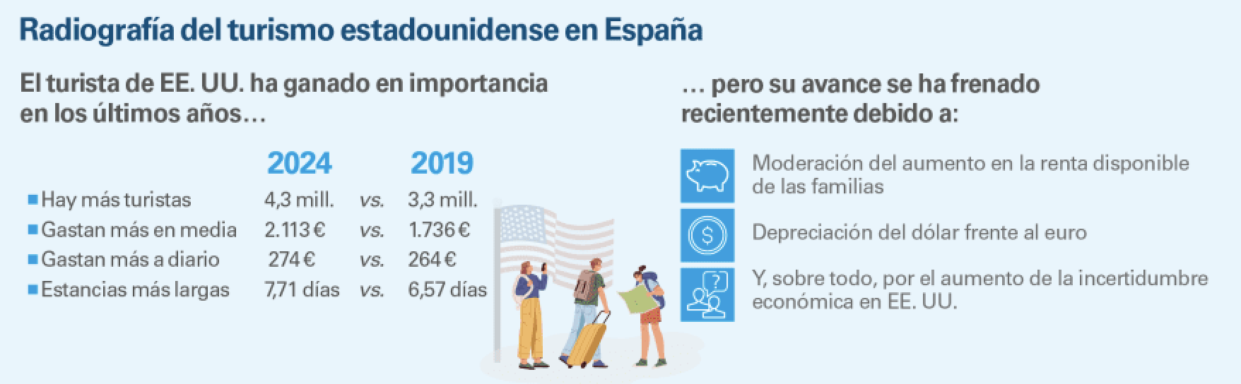 El sector turístico español solo tiene una incertidumbre por delante: ¿qué pasará con los visitantes procedentes de Estados Unidos? Lo cierto es que, pese a que España cada vez registra más turistas estadounidenses, que también gastan más, este crecimiento se está moderando.