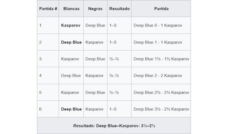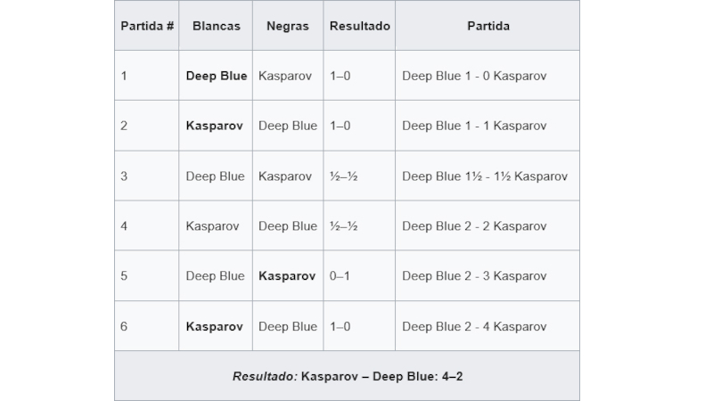 Con una atención mediática sin precedentes, se sentaron ante el tablero el jugador ruso y un programador de IBM, que había trabajado en el proyecto Deep Blue. A su lado, un teclado con el que introducía la jugada de Kasparov y una pantalla en la que podía ver el movimiento que la máquina deseaba realizar. Así las cosas, la computadora golpeó primero. Deep Blue, con blancas, venció el primer asalto y se convirtió en el primer ordenador que lograba doblegar a todo un campeón del mundo. No volvería a ganar, al menos ese año. Kasparov venció la siguiente partida, firmó dos tablas y doblegó a la máquina dos veces más. Fue una victoria sin paliativos. La hegemonía humana no corría peligro… o sí.