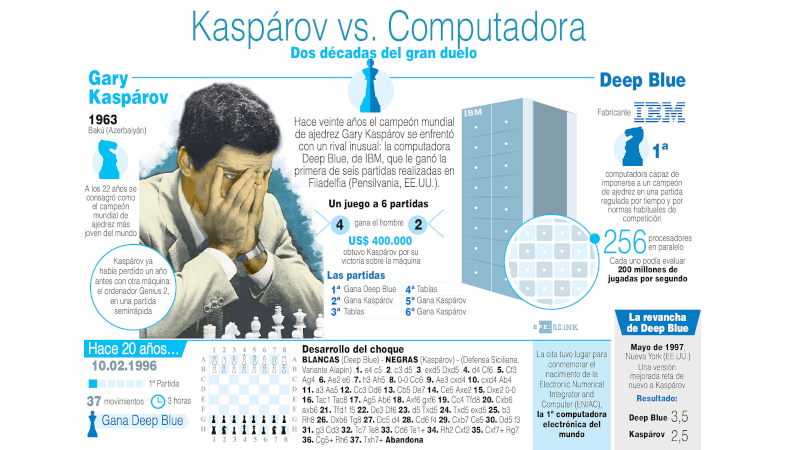 En 1996, el gigante de la informática IBM desafió al mejor jugador de ajedrez de la historia. Su superordenador Deep Blue se enfrentaría al campeón ruso en un duelo al mejor de seis partidas. Sería la demostración de que la capacidad de proceso de una máquina había superado, por fin, al cerebro humano en un clásico del cálculo y la precisión, como es el juego del ajedrez. Kasparov aceptó y se citaron en el mes de febrero en Filadelfia (Pensilvania, USA).